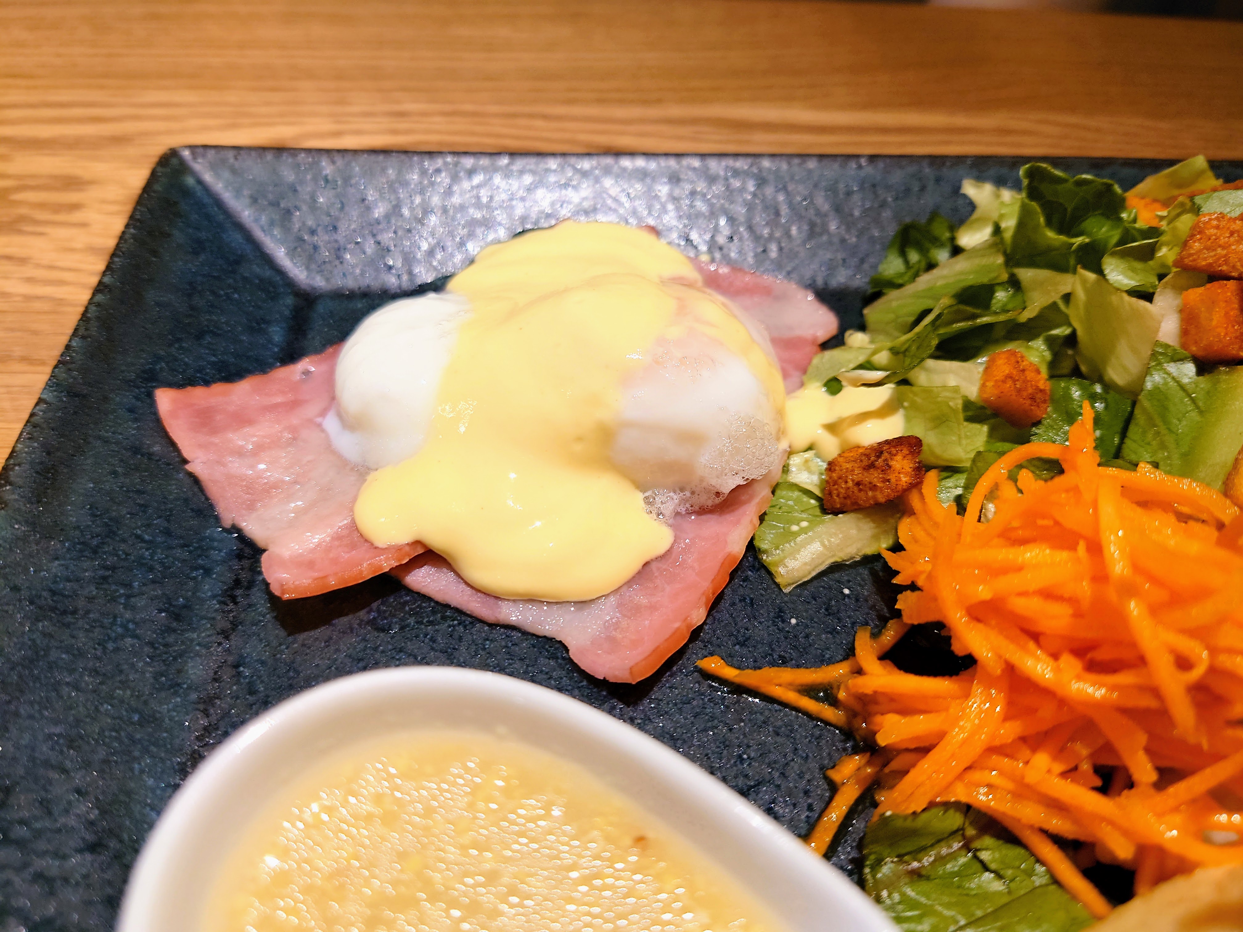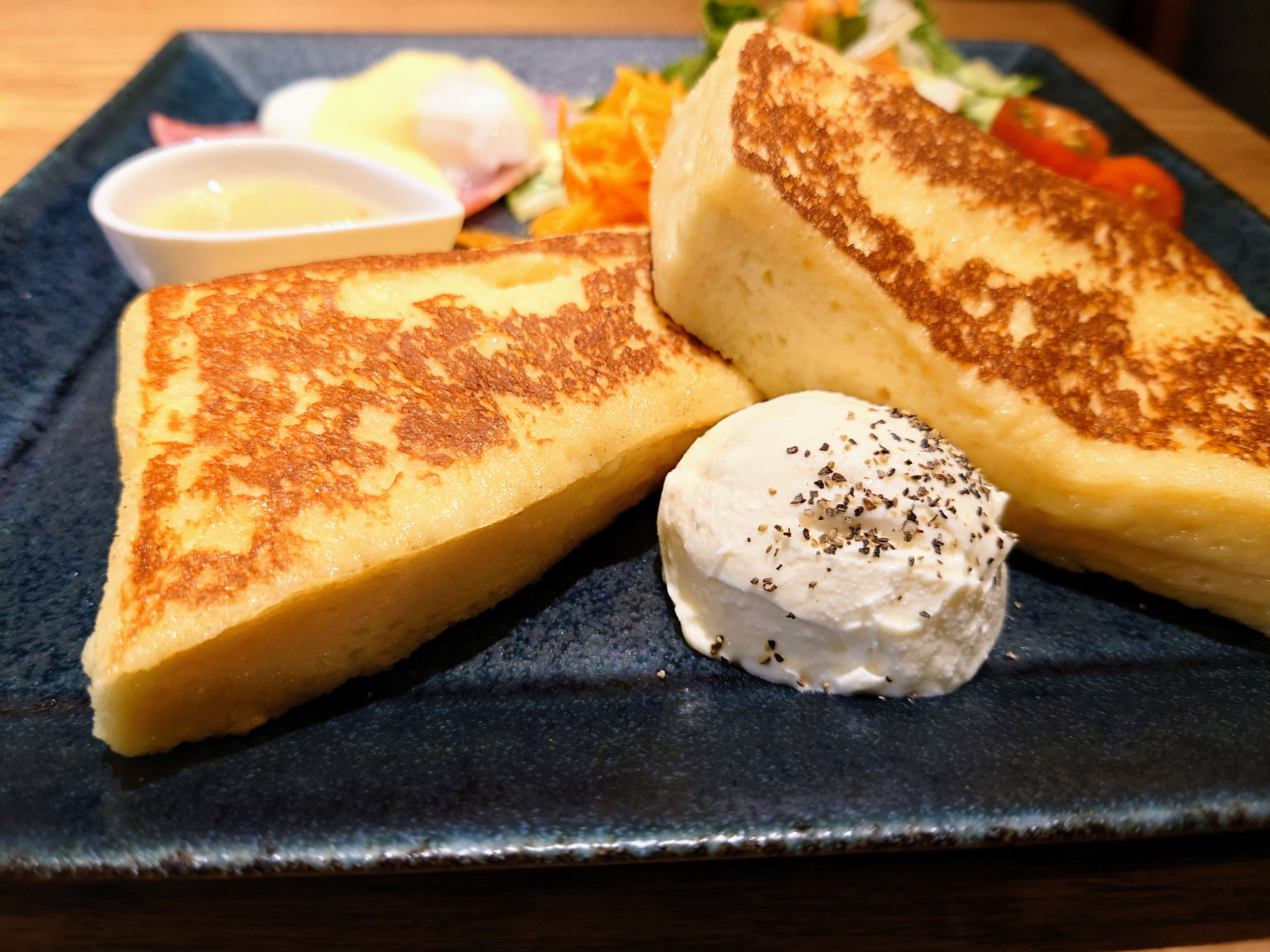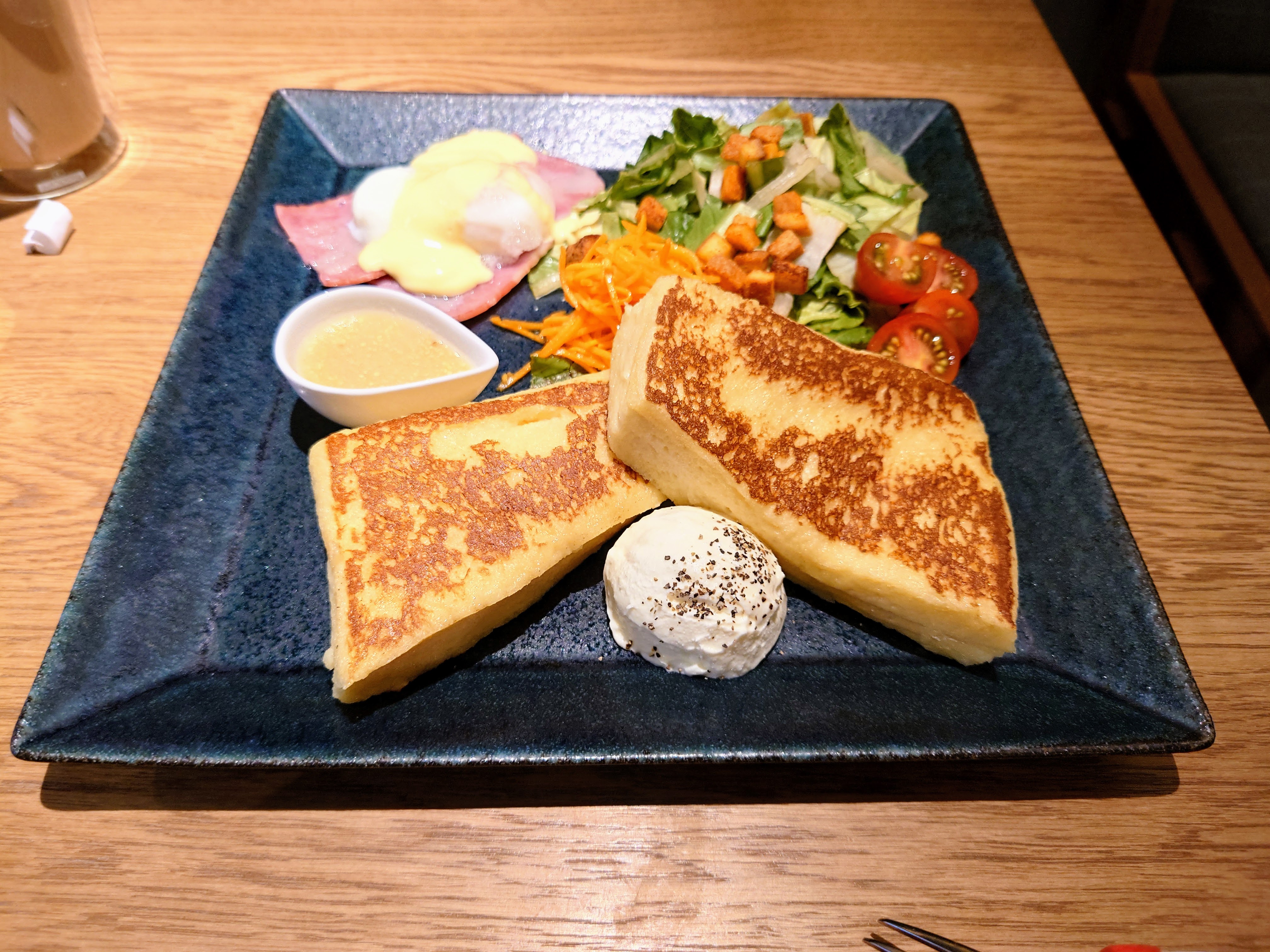 フレンチトーストはプレートタイプで、ミニサラダが付いてきます。きめが細かく、しっとりしていてぷるぷる食感の手堅い美味しさ。爽やかな酸味と控えめの甘さのあるクリームを少しずつ付けながら頂きました。